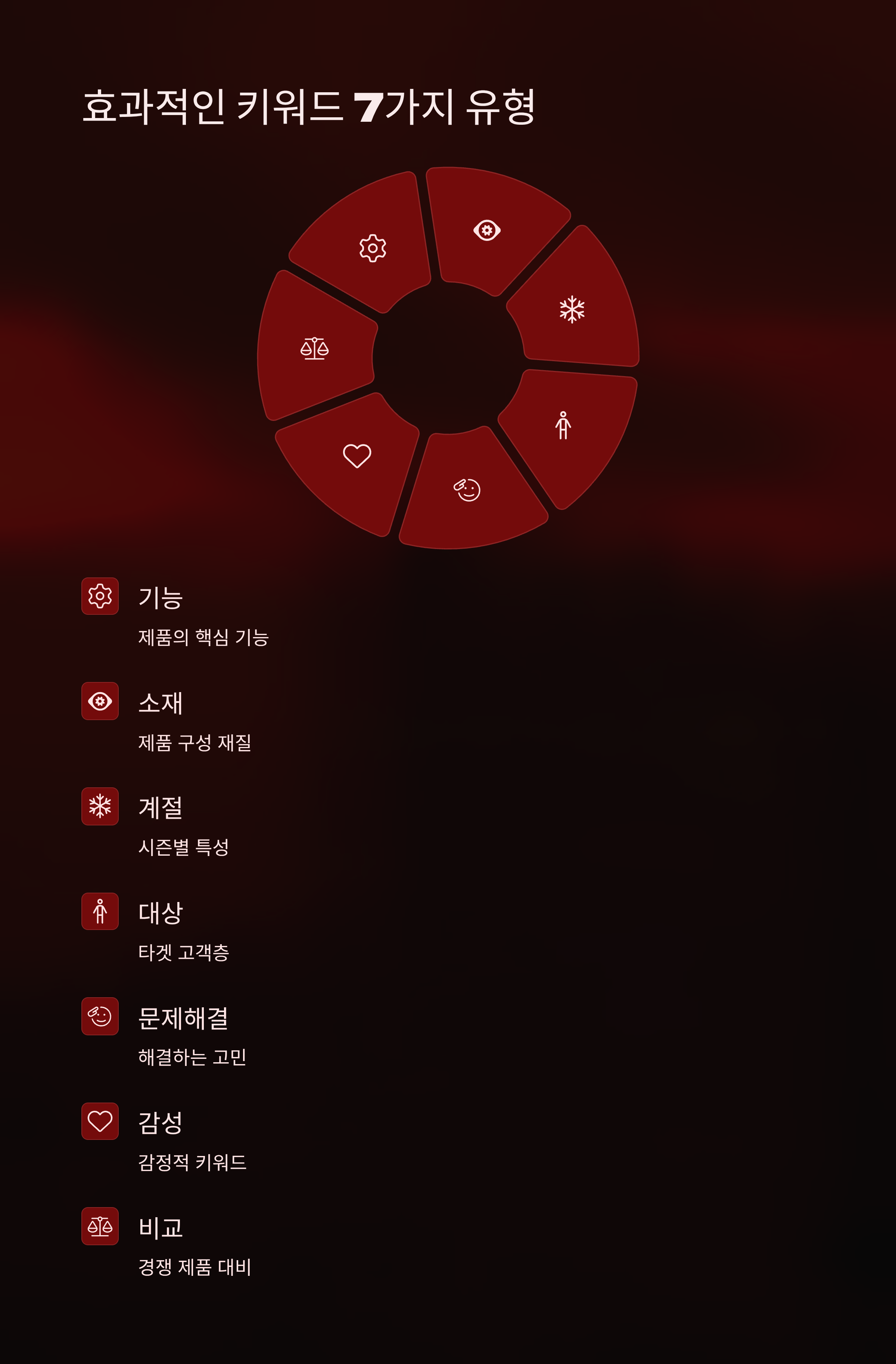 아래 7가지 키워드는 상품 검색 유입을 극대화하기 위한 프레임입니다. 단어 그대로 쓰기보다는 내 상품에 맞게 조합/응용해야 효과가 큽니다.